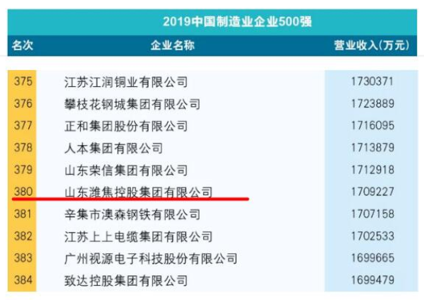 近日,在2019中國500強企業(yè)高峰論壇上,中國企業(yè)聯(lián)合會、中國企業(yè)家協(xié)會聯(lián)合發(fā)布了“2019中國制造業(yè)企業(yè)500強”榜單,山東濰焦控股集團有限公司再次榮登榜單,位列中國制造業(yè)企業(yè)500強第380位,比去年提高了一個位次。