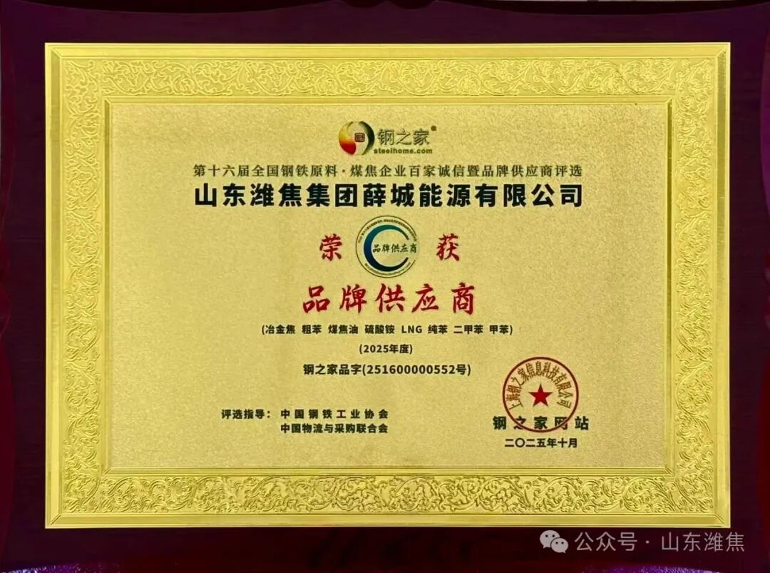 近日,“鋼之家第十六屆全國(guó)鋼鐵原料煤焦企業(yè)百家誠(chéng)信暨品牌供應(yīng)商”評(píng)選活動(dòng)順利舉行,經(jīng)鋼之家網(wǎng)站征信取證,中國(guó)鋼鐵工業(yè)協(xié)會(huì)及中國(guó)物流與采購(gòu)聯(lián)合會(huì)專家綜合評(píng)審,山東濰焦集團(tuán)薛城能源有限公司被評(píng)為2025年度“品牌供應(yīng)商”殊榮。榮譽(yù)證書