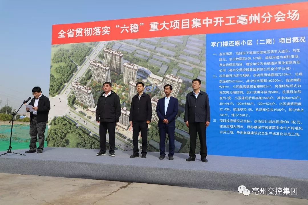 10月28日上午,市貫徹落實(shí)“六穩(wěn)”重大項(xiàng)目集中開工儀式在譙城區(qū)李門樓還原小區(qū)項(xiàng)目現(xiàn)場舉行。市委常委、常務(wù)副市長李軍,市政府副秘書長劉巖,市直有關(guān)單位主要負(fù)責(zé)人,各縣區(qū)政府分管負(fù)責(zé)人,集團(tuán)黨委副書記、總經(jīng)理劉超,財(cái)務(wù)總監(jiān)董雷出席開工儀式。