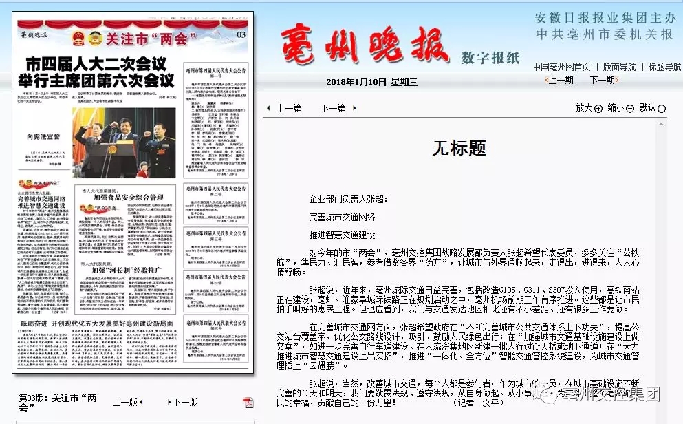亳州晚報2018年1月10日第三版刊登了記者對交控集團戰(zhàn)略發(fā)展部負責人張超的采訪,全文如下: