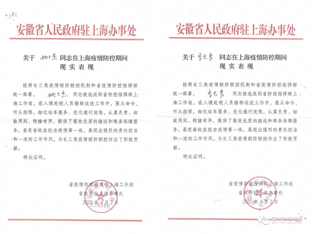 證明文件中寫道,“兩人在入境赴皖人員接轉(zhuǎn)運送工作中,服從命令、聽從指揮,細(xì)化站車服務(wù)、優(yōu)化通行流程,認(rèn)真負(fù)責(zé)、細(xì)致周到、銜接有序,提供了高效優(yōu)質(zhì)的接送和乘務(wù)保障服務(wù),晝夜奮戰(zhàn)在抗擊疫情第一線,展現(xiàn)出強烈的責(zé)任擔(dān)當(dāng)和一流的工作作風(fēng),為長三角疫情聯(lián)防聯(lián)控做出了積極貢獻(xiàn)”。
