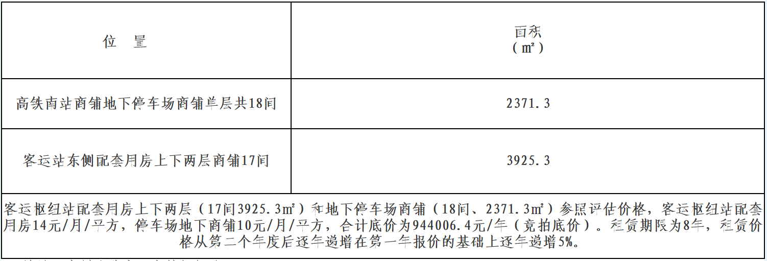 受安徽通享交通科技有限公司委托,現(xiàn)對(duì)高鐵南站商鋪資產(chǎn)招標(biāo)項(xiàng)目進(jìn)行公開招標(biāo),請(qǐng)合格投標(biāo)人參加投標(biāo)。