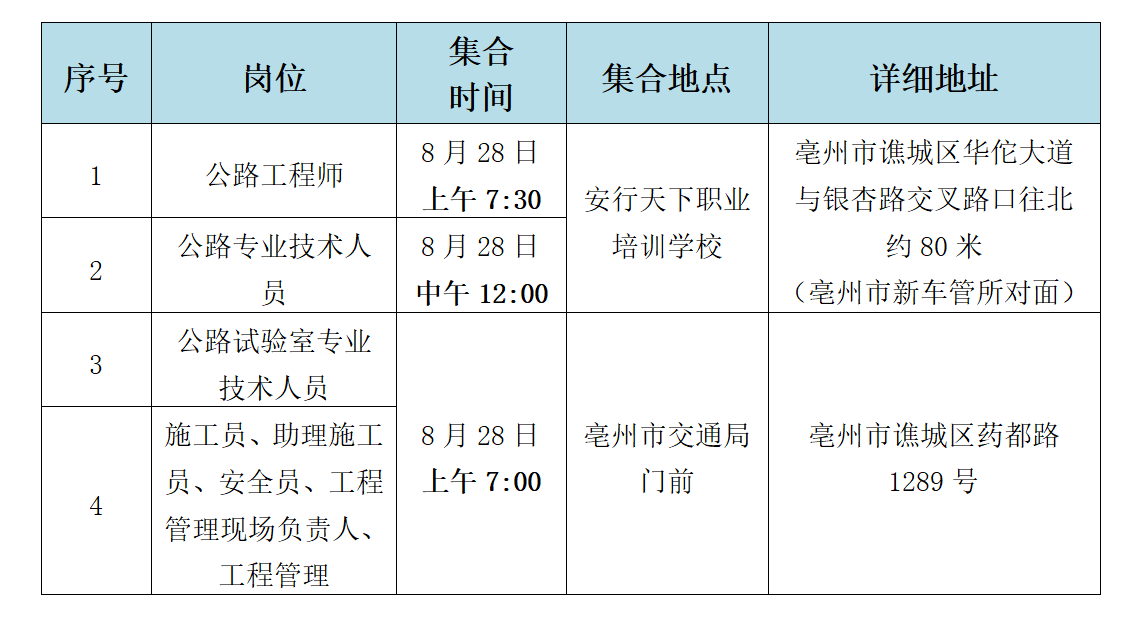 亳州市交通資產(chǎn)管理有限責任公司2021年工程專業(yè)技術(shù)人員實操測試時間定于2021年8月28日(本周六)上午7:00開始,具體安排如下: