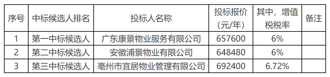 招標人確定廣東康景物業(yè)服務(wù)有限公司為中標人,中標價657600元每年,服務(wù)期限自合同簽訂之日起3年,質(zhì)量標準符合國家、地方、行業(yè)現(xiàn)行相關(guān)規(guī)范合格標準,符合招標文件第五章發(fā)包人要求。
