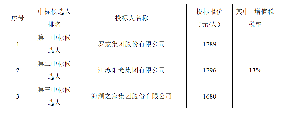 根據(jù)有關(guān)規(guī)定,招標(biāo)人確定羅蒙集團(tuán)股份有限公司為中標(biāo)人,中標(biāo)價為1789元每人,交貨期:自合同簽訂之日起20日歷天內(nèi)完成全部春秋裝(西裝上衣、西褲、長袖襯衫)量體、生產(chǎn)及供貨;自合同簽訂之日起50日歷天內(nèi)完成全部夏裝(短袖襯衫、夏褲)量體、生產(chǎn)及供貨,交貨地點:亳州市內(nèi),招標(biāo)人指定地點,完成本項目投標(biāo)產(chǎn)品的量體、生產(chǎn)、供貨、調(diào)試、售后服務(wù)等工作。