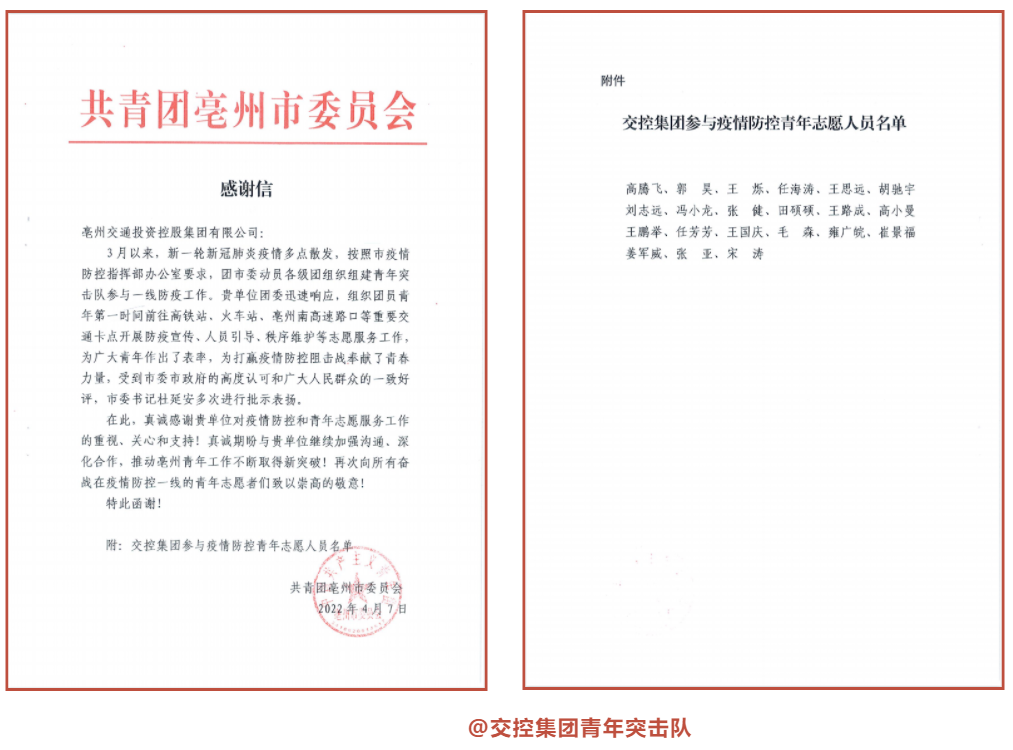 4月7日,交控集團(tuán)收到來(lái)自團(tuán)市委發(fā)來(lái)的感謝信,對(duì)集團(tuán)迅速組建青年突擊隊(duì)積極參與疫情防控,第一時(shí)間前往高鐵站開展防疫宣傳、人員引導(dǎo)、秩序維護(hù)等志愿服務(wù)工作,予以充分肯定與表?yè)P(yáng)。