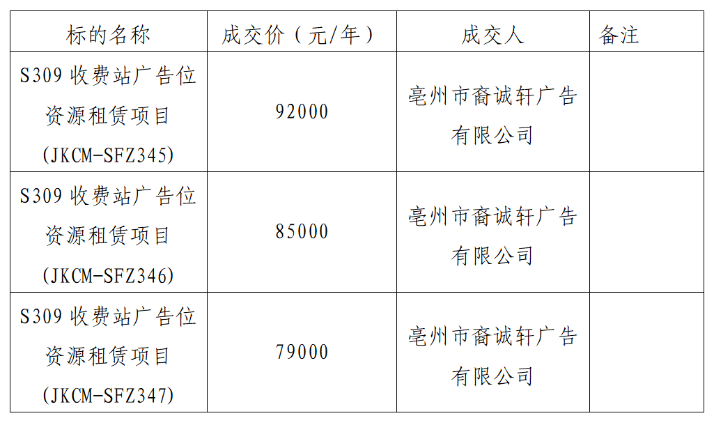 亳州S309收費(fèi)站廣告位資源租賃項(xiàng)目(項(xiàng)目編號(hào):TX-2022-02號(hào))于2022年4月22日9時(shí)00分進(jìn)行公開(kāi)競(jìng)價(jià),現(xiàn)競(jìng)價(jià)工作已結(jié)束,并經(jīng)采購(gòu)人確認(rèn),將競(jìng)價(jià)結(jié)果公示如下: