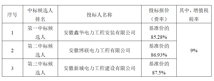 根據(jù)有關(guān)規(guī)定,招標(biāo)人確定安徽鑫華電力工程安裝有限公司為中標(biāo)人,中標(biāo)價(jià)為以工程造價(jià)咨詢機(jī)構(gòu)編制的招標(biāo)控制價(jià)為基準(zhǔn),基準(zhǔn)價(jià)的85.28%(其中,增值稅稅率為9%),工期60日歷天,按合同約定實(shí)施和完成承包工程,修補(bǔ)工程中的任何缺陷,工程質(zhì)量符合國家、地方、行業(yè)現(xiàn)行相關(guān)規(guī)范合格標(biāo)準(zhǔn),符合設(shè)計(jì)圖紙、圖集規(guī)定標(biāo)準(zhǔn),通過供電主管部門驗(yàn)收,滿足招標(biāo)文件第五章技術(shù)標(biāo)準(zhǔn)和要求。