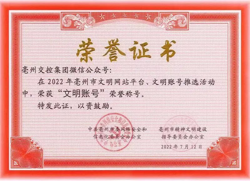 “亳州交控集團(tuán)”微信公眾號(hào)榮獲“2022年亳州市文明賬號(hào)”