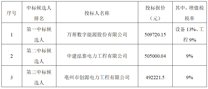 根據(jù)有關(guān)規(guī)定,招標(biāo)人確定萬幫數(shù)字能源股份有限公司為中標(biāo)人,中標(biāo)價(jià)為人民幣(大寫)伍拾萬玖仟柒佰貳拾元壹角伍分,(小寫)509720.15元(其中,增值稅稅率為設(shè)備13%、工程9%),工期30日歷天,按合同約定實(shí)施和完成承包工程,修補(bǔ)工程中的任何缺陷,工程質(zhì)量符合國家、地方、行業(yè)現(xiàn)行相關(guān)規(guī)范合格標(biāo)準(zhǔn),符合設(shè)計(jì)圖紙、圖集規(guī)定標(biāo)準(zhǔn),通過招標(biāo)人、供電主管部門驗(yàn)收,滿足招標(biāo)文件第五章技術(shù)標(biāo)準(zhǔn)和要求。