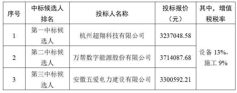 根據(jù)有關(guān)規(guī)定,招標人確定杭州超翔科技有限公司為中標人,中標價為人民幣(大寫)叁佰貳拾叁萬柒仟零肆拾捌元伍角捌分,(小寫)3237048.58元(其中,增值稅稅率為設(shè)備13%、施工9%),工期30日歷天,以“交鑰匙”方式,按照審核確認的設(shè)計圖紙、工程量清單及招標人要求,完成亳州市城區(qū)建設(shè)充電樁場站項目工程材料及設(shè)備采購、施工、安裝、調(diào)試、竣工驗收、正式送電、缺陷責任期內(nèi)工程質(zhì)量保修等全部工作,工程質(zhì)量符合國家、地方、行業(yè)現(xiàn)行相關(guān)規(guī)范合格標準,符合設(shè)計圖紙、圖集規(guī)定標準,通過招標人、供電主管部門驗收,滿足招標文件第五章技術(shù)標準和要求。