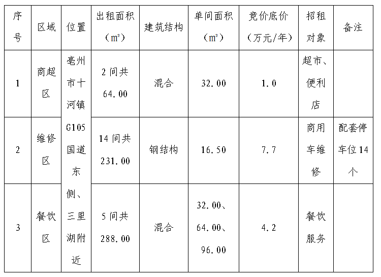 (二)招租范圍:本項(xiàng)目招租對象商超、汽車維修、餐飲。招租范圍及競價底價詳見下表: