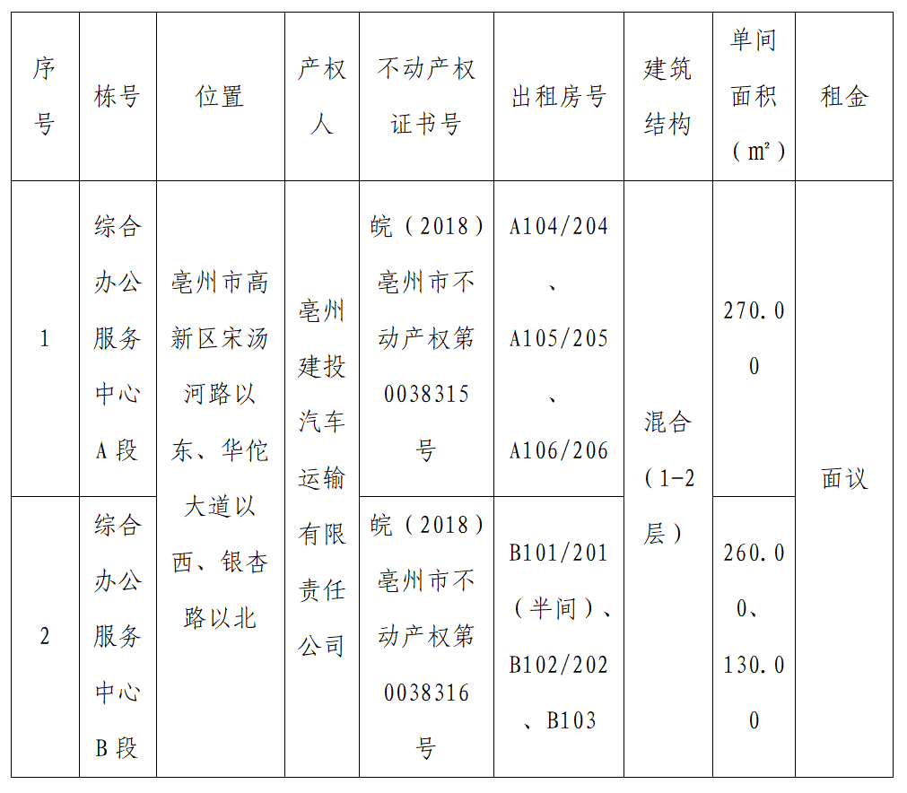 本招租項(xiàng)目為亳州建投汽車運(yùn)輸有限責(zé)任公司綜合辦公服務(wù)中心剩余臨街商鋪,招租人為亳州建投汽車運(yùn)輸有限責(zé)任公司,現(xiàn)對(duì)該項(xiàng)目進(jìn)行公開招租。
