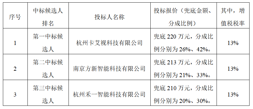 經(jīng)評審,招標(biāo)人確定杭州卡艾視科技有限公司為中標(biāo)人,中標(biāo)價為兜底金額每年不低于220萬元;年?duì)I業(yè)超過400萬元時,超過400萬元的部分招標(biāo)人分成比例不低于26%;年?duì)I業(yè)收入超過600萬元時,超過600萬元的部分招標(biāo)人分成比例不低于42%;其中增值稅稅率為13%。服務(wù)期限:自合同簽訂之日起5年,質(zhì)量標(biāo)準(zhǔn):符合國家、地方、行業(yè)現(xiàn)行相關(guān)規(guī)范合格標(biāo)準(zhǔn),符合招標(biāo)人要求及運(yùn)營考核標(biāo)準(zhǔn),按合同約定完成本項(xiàng)目全部工作。