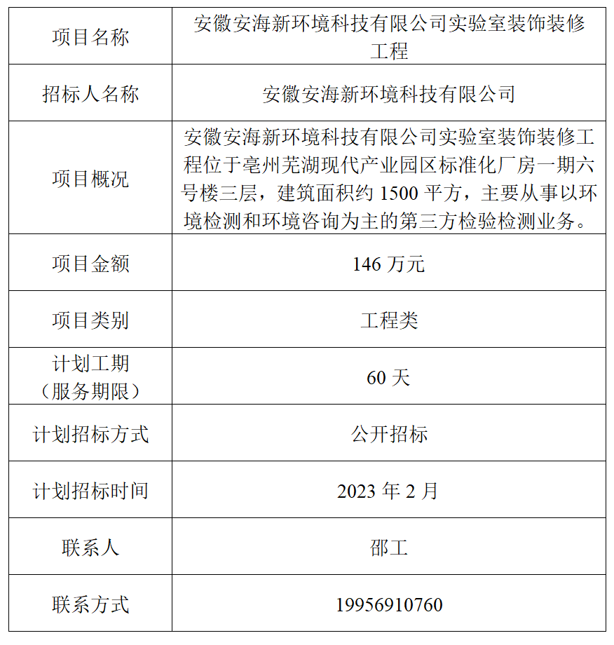 為便于潛在投標(biāo)人及時了解招標(biāo)信息,現(xiàn)將安徽安海新環(huán)境科技有限公司的招標(biāo)計劃發(fā)布如下: