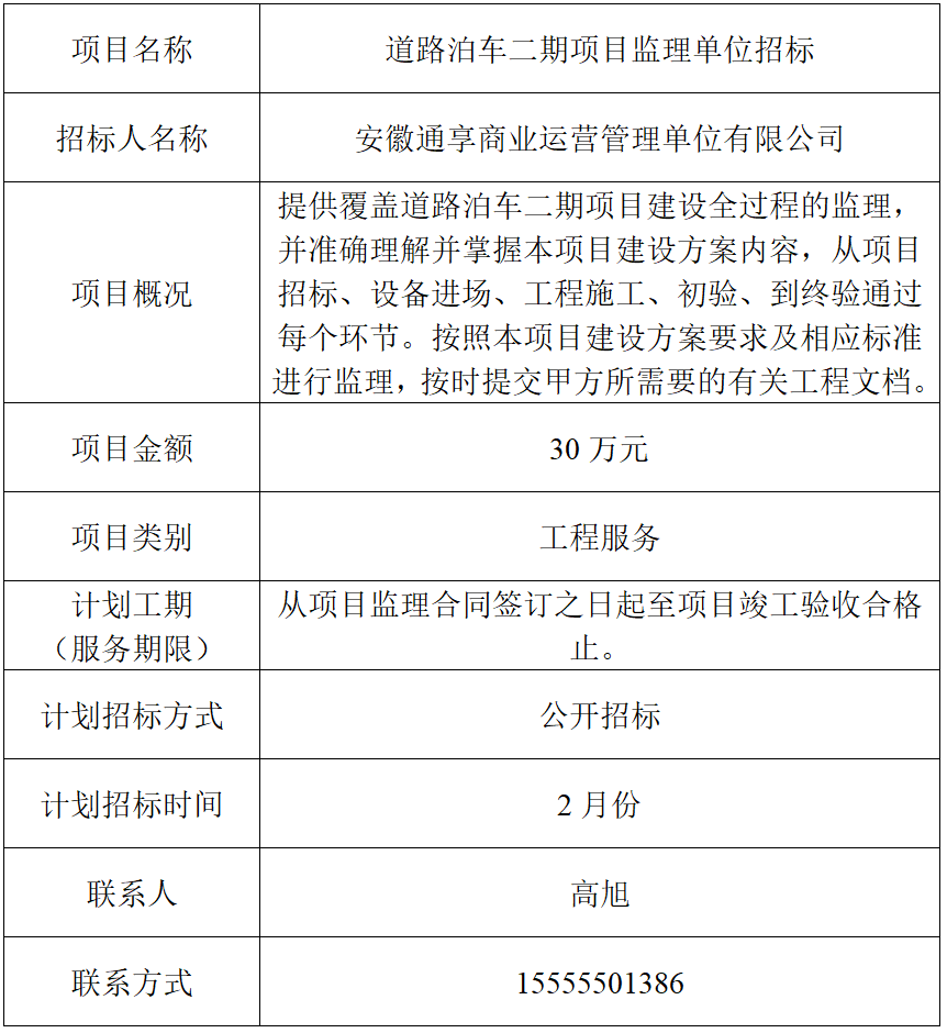 為便于潛在投標(biāo)人及時了解招標(biāo)信息,現(xiàn)將安徽通享商業(yè)運營管理單位有限公司(招標(biāo)人名稱)的招標(biāo)計劃發(fā)布如下: