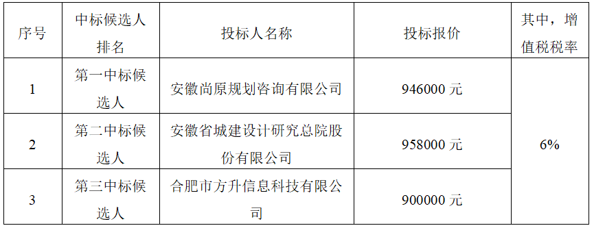 經(jīng)評審,招標(biāo)人確定安徽尚原規(guī)劃咨詢有限公司為中標(biāo)人,中標(biāo)價為人民幣(大寫)玖拾肆萬陸仟元整,(小寫)946000元(其中,增值稅稅率6%),服務(wù)期限:自合同簽訂之日起1年,按合同約定完成本項目全部工作。