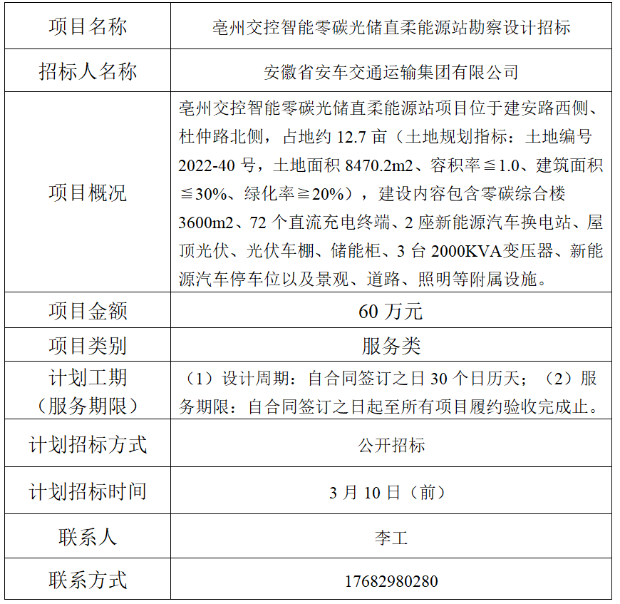 為便于潛在投標(biāo)人及時了解招標(biāo)信息,現(xiàn)將安徽省安車交通運(yùn)輸集團(tuán)有限公司 (招標(biāo)人名稱)的招標(biāo)計劃發(fā)布如下: