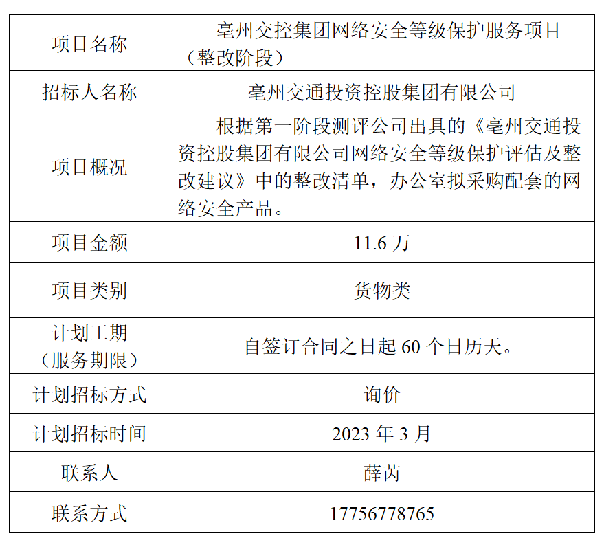 為便于潛在投標(biāo)人及時了解招標(biāo)信息,現(xiàn)將亳州交通投資控股集團(tuán)有限公司(招標(biāo)人名稱)的招標(biāo)計(jì)劃發(fā)布如下: