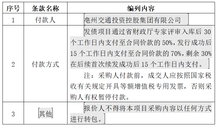 (三)服務(wù)期限(供貨期/計劃工期):自合同簽訂之日起至項目申報額度全部發(fā)行完成,該項目其他年度專項債發(fā)行咨詢服務(wù)及額度調(diào)整不再另行收費。