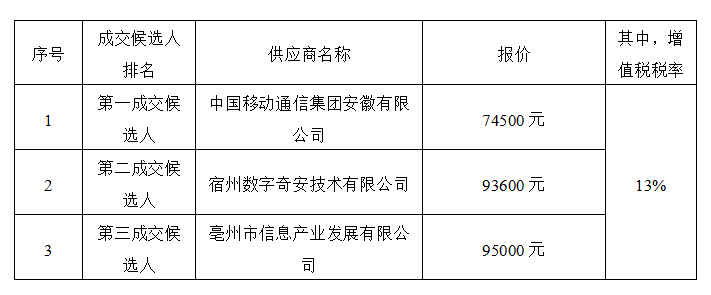 經(jīng)評審,采購人確定中國移動通信集團安徽有限公司為成交人,成交價為人民幣(大寫)柒萬肆仟伍佰元整,(小寫)74500元(其中,增值稅稅率13%),計劃工期:自合同簽訂之日起60日歷天內安裝、調試完成,質量標準:符合國家、地方、行業(yè)現(xiàn)行相關規(guī)范合格標準,按合同約定完成本項目全部工作。