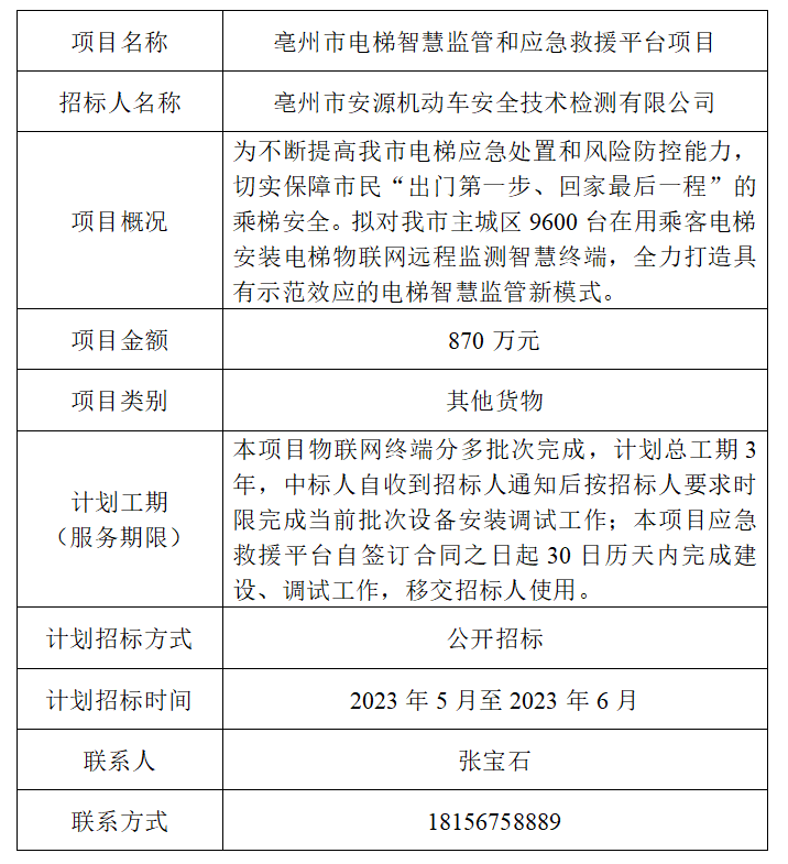 為便于潛在投標人及時了解招標信息,現(xiàn)將亳州市安源機動車安全技術檢測有限公司(招標人名稱)的招標計劃發(fā)布如下: