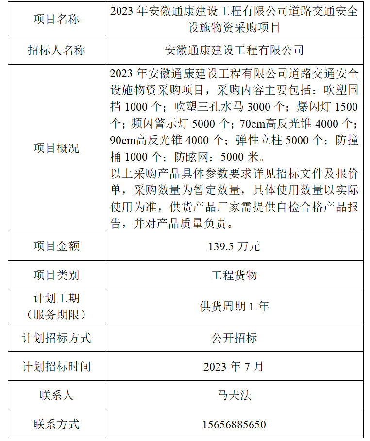 為便于潛在投標(biāo)人及時了解招標(biāo)信息,現(xiàn)將安徽通康建設(shè)工程有限公司(招標(biāo)人名稱)的招標(biāo)計劃發(fā)布如下: