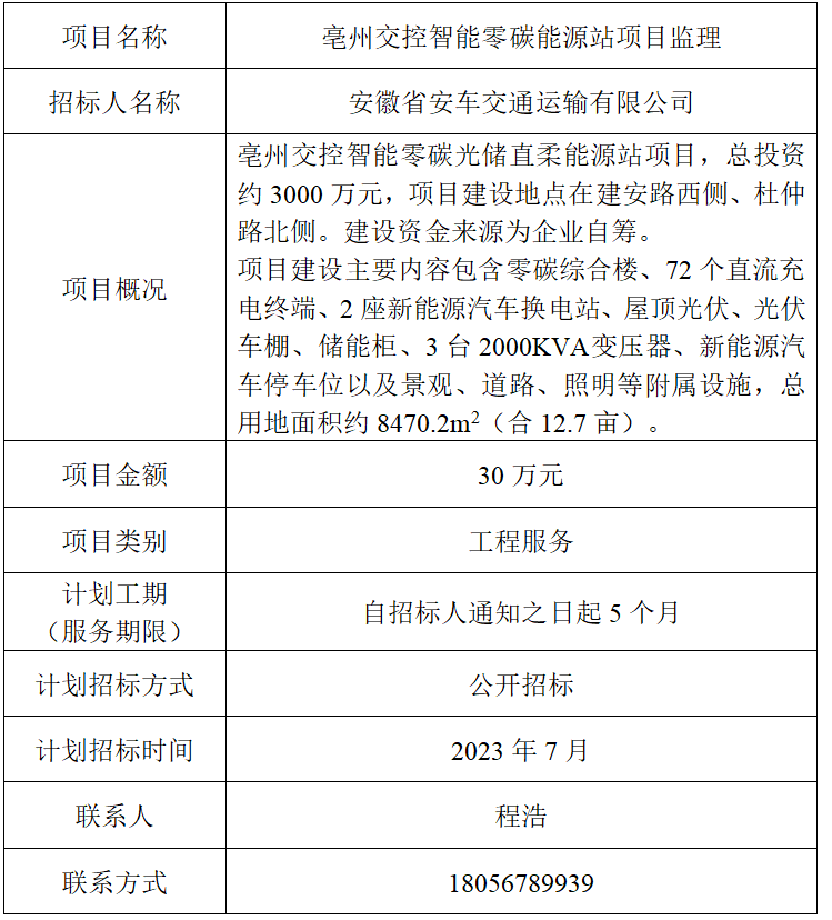 為便于潛在投標人及時了解招標信息,現(xiàn)將安徽省安車交通運輸有限公司(招標人名稱)的招標計劃發(fā)布如下: