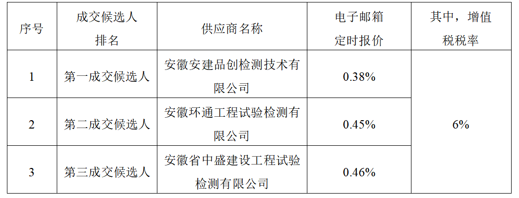 采購人確定安徽安建品創(chuàng)檢測技術(shù)有限公司為標包二交竣工檢測成交人,成交價按照施工最終審定價款為基數(shù),費率0.38%(其中,增值稅稅率為6%),服務期限自簽訂工程建設(shè)合同之日起,至工程保修期滿,質(zhì)量標準符合國家、地方、行業(yè)現(xiàn)行相關(guān)規(guī)范合格標準。