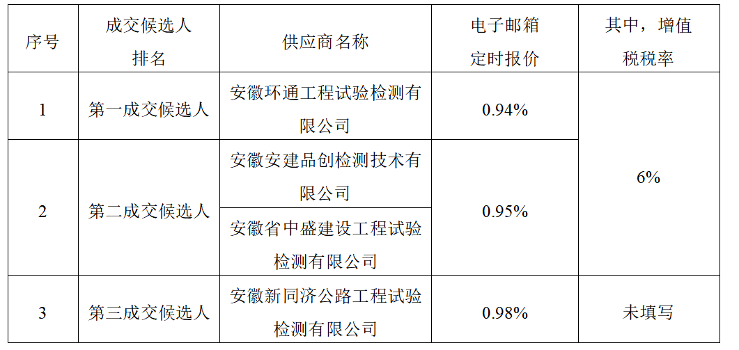 采購人確定安徽環(huán)通工程試驗檢測有限公司為標包一中心試驗室成交人,成交價按照施工最終審定價款為基數(shù),費率0.94%(其中,增值稅稅率為6%),服務期限自簽訂工程建設(shè)合同之日起,至工程保修期滿,質(zhì)量標準符合國家、地方、行業(yè)現(xiàn)行相關(guān)規(guī)范合格標準。