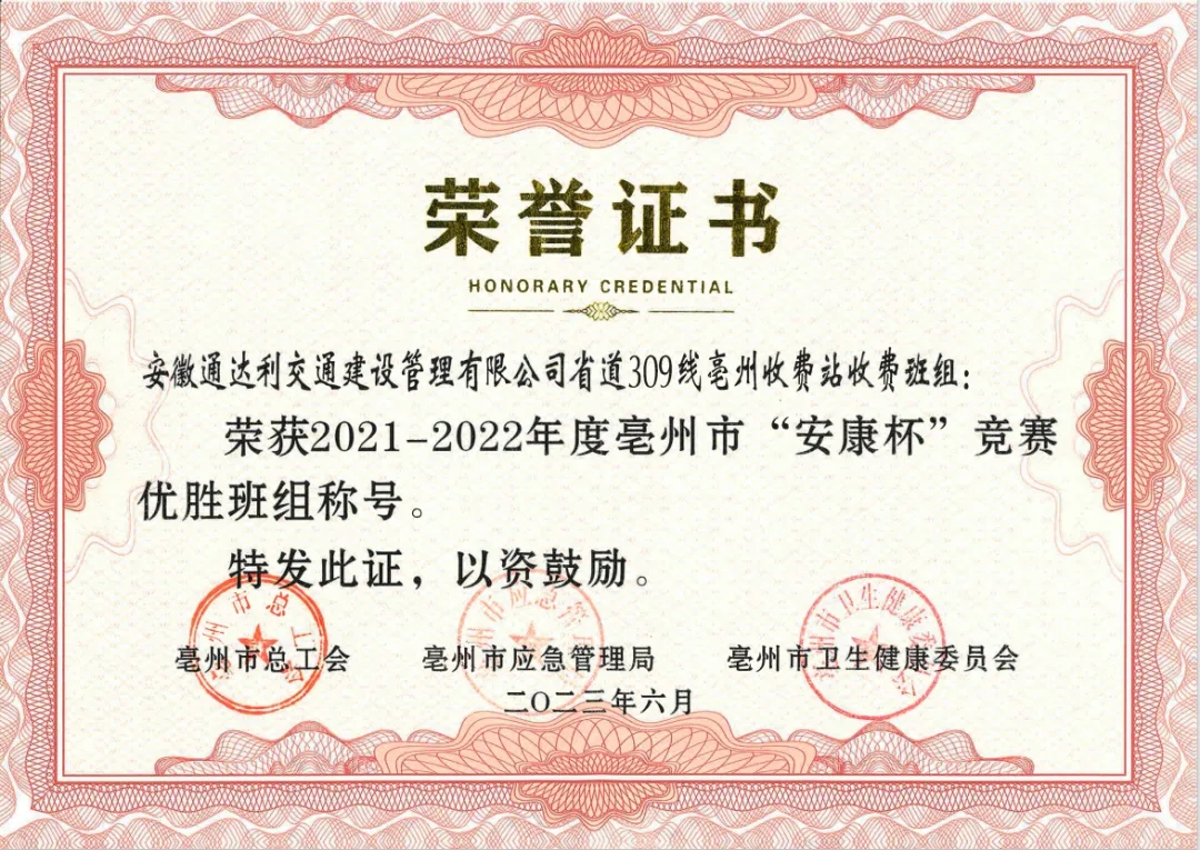 近日,市總工會(huì)、市應(yīng)急管理局、市衛(wèi)生健康委員會(huì)聯(lián)合下發(fā)《關(guān)于表彰2021-2022年度全市“安康杯”競(jìng)賽先進(jìn)集體和先進(jìn)個(gè)人的決定》(亳工〔2023〕55號(hào)),表彰在2021-2022年度全市“安康杯”競(jìng)賽活動(dòng)中取得優(yōu)異成績(jī)的集體和個(gè)人。其中,交控集團(tuán)下屬單位、班組榮獲優(yōu)勝單位、優(yōu)勝班組、優(yōu)秀個(gè)人等多項(xiàng)榮譽(yù)。