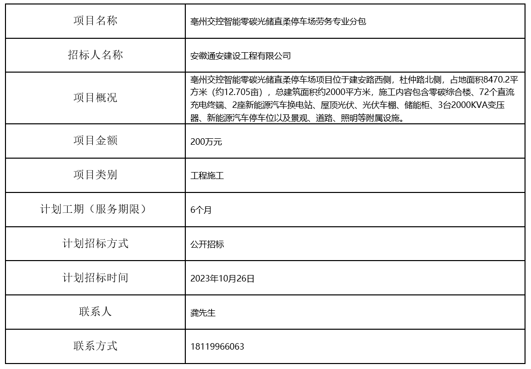 亳州交控智能零碳光儲(chǔ)直柔停車場(chǎng)勞務(wù)專業(yè)分包項(xiàng)目招標(biāo)計(jì)劃