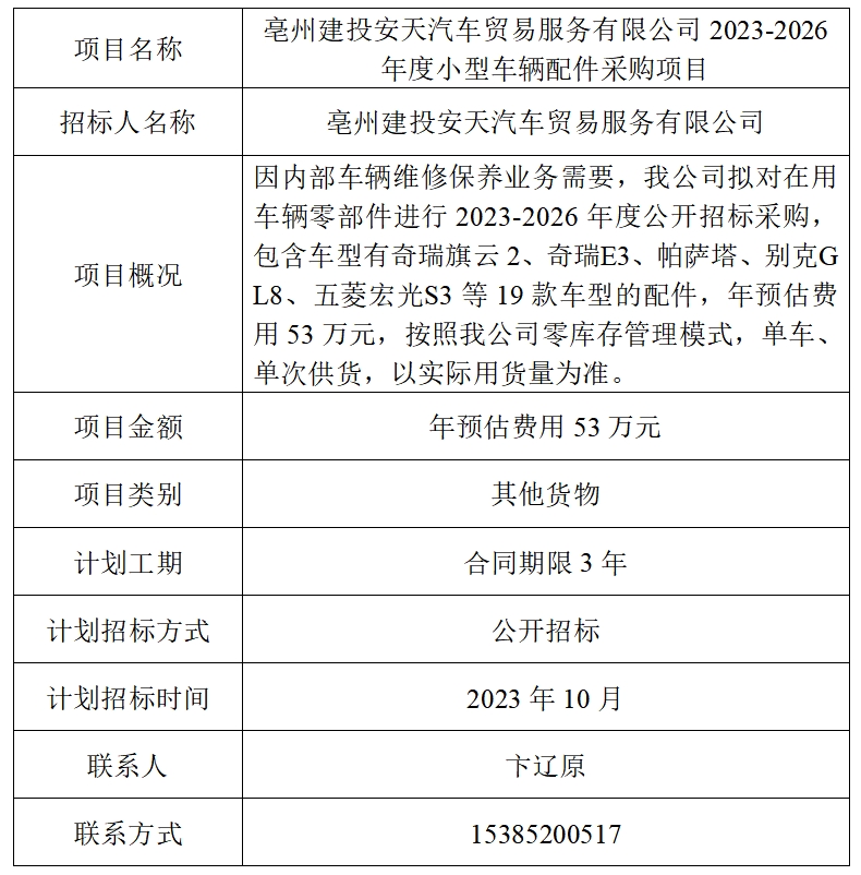 為便于潛在投標(biāo)人及時(shí)了解招標(biāo)信息,現(xiàn)將亳州建投安天汽車貿(mào)易服務(wù)有限公司(招標(biāo)人名稱)的招標(biāo)計(jì)劃發(fā)布如下: