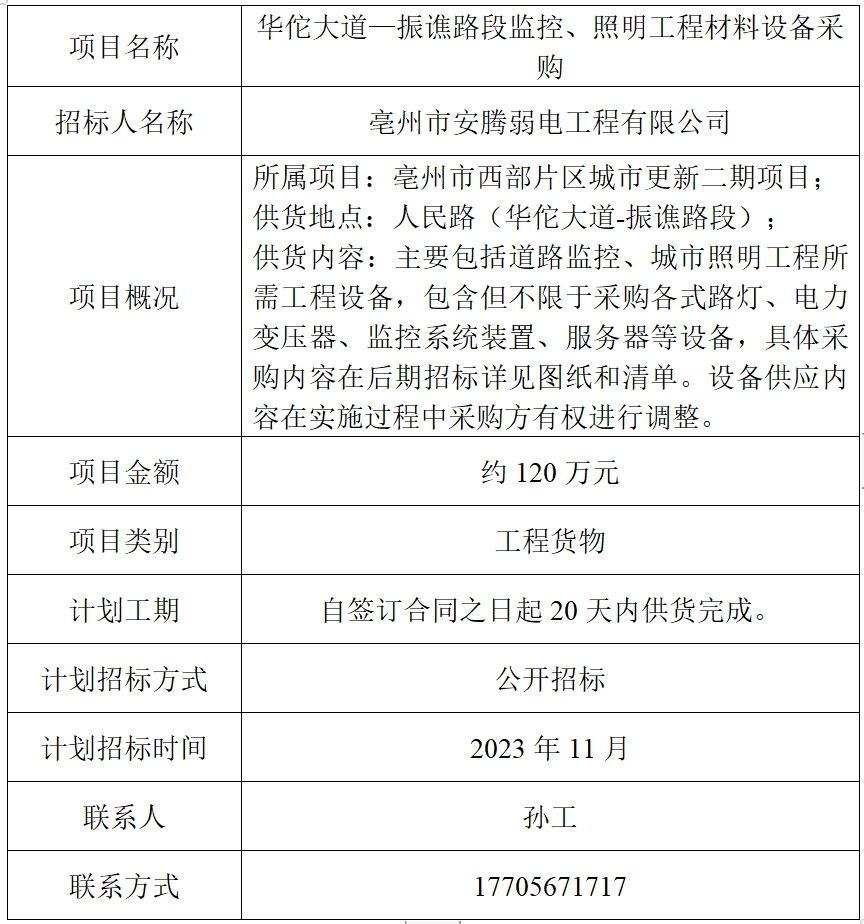 為便于潛在投標(biāo)人及時(shí)了解招標(biāo)信息,現(xiàn)將亳州市安騰弱電工程有限公司(招標(biāo)人名稱(chēng))的招標(biāo)計(jì)劃發(fā)布如下:
