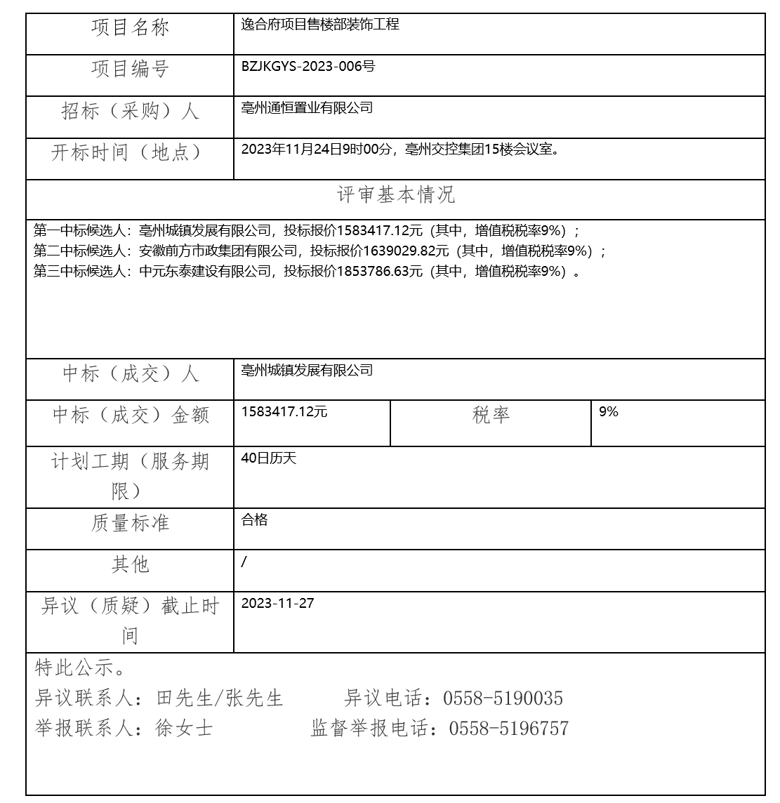 逸合府項(xiàng)目售樓部裝飾工程中標(biāo)結(jié)果公示