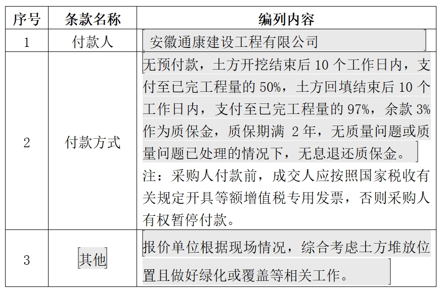 (五)最高限價(含增值稅,稅率9%):9.5元/開挖1m³,9.5元/回填1m³ ,供應(yīng)商按固定單價報價。合同為固定單價合同。報價超出固定單價或為可能影響合同履約異常低價的,按無效響應(yīng)處理。報價包含但不限于以下費(fèi)用:項目清表、土方工程開挖、外運(yùn)、清基槽、刷坡、土方回填(含室內(nèi))、壓實等所需的人工、機(jī)械機(jī)具、運(yùn)輸車輛以及為滿足安全文明環(huán)保施工提供所需的灑水車、霧炮機(jī)、裸土覆蓋以及車輛進(jìn)出所需的鋼板,沖洗人員、高壓沖洗設(shè)備及施工用水電費(fèi)用、渣土處理費(fèi)等以及因?qū)I(yè)分包范圍內(nèi)需要協(xié)調(diào)政府相關(guān)部門等工作。