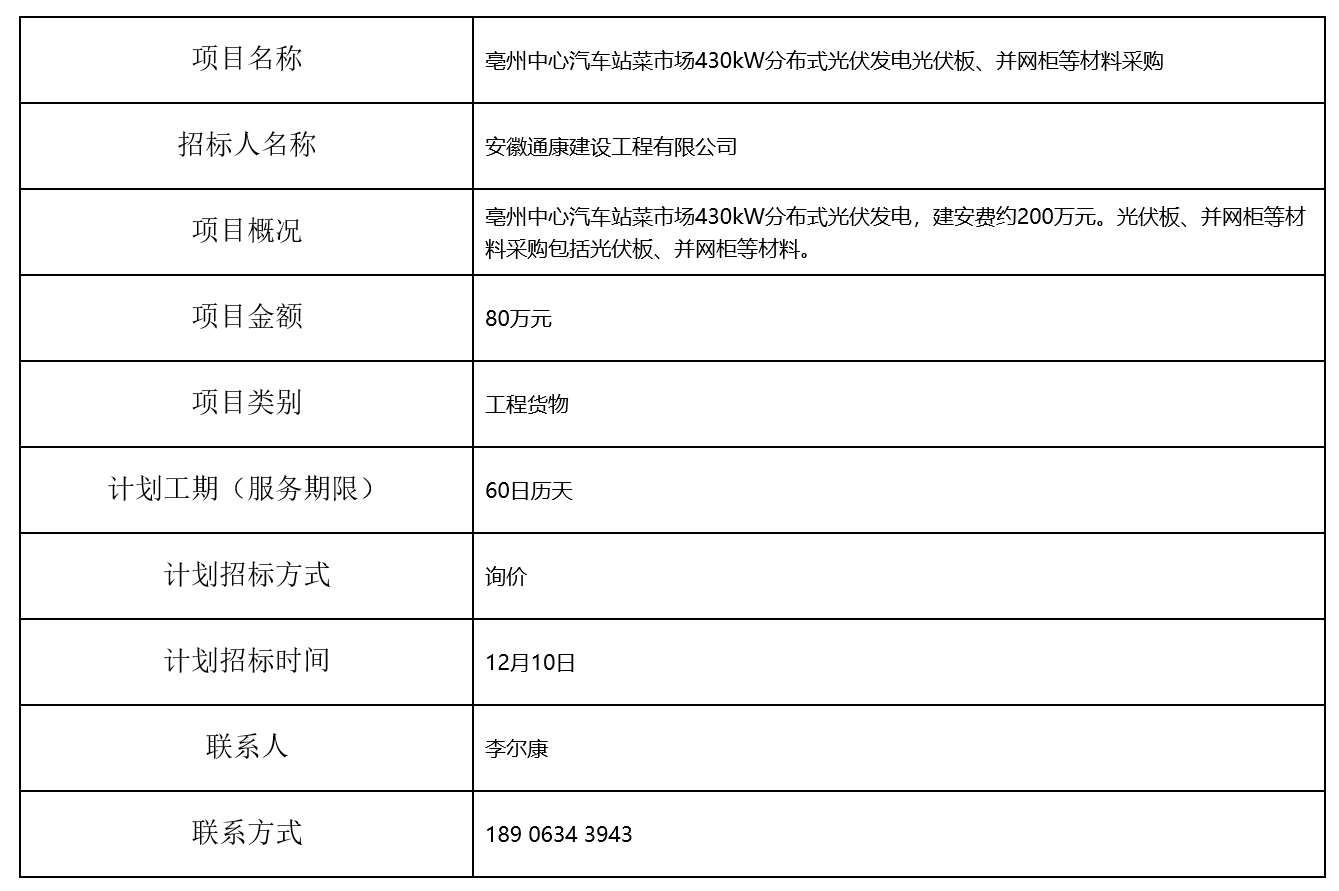 亳州中心汽車站菜市場430kW分布式光伏發(fā)電光伏板、并網柜等材料采購招標計劃