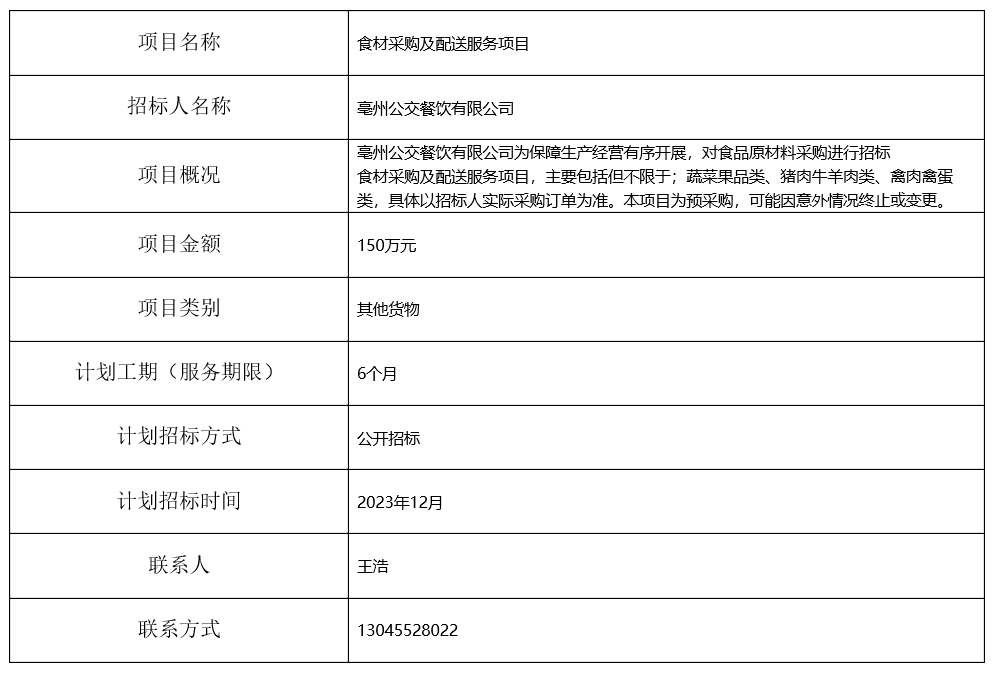 亳州公交餐飲有限公司食材采購(gòu)及配送服務(wù)項(xiàng)目招標(biāo)計(jì)劃