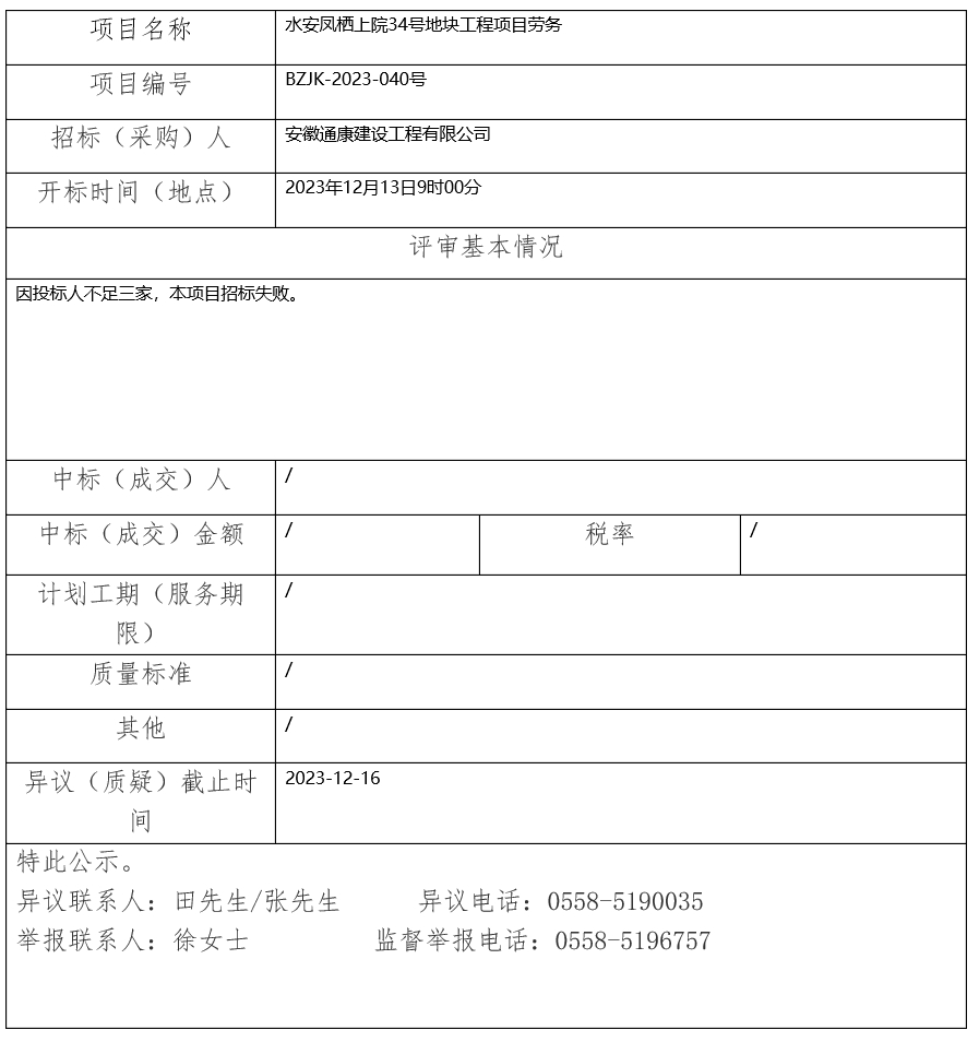 水安鳳棲上院34號地塊工程項目勞務中標(成交)結果公示