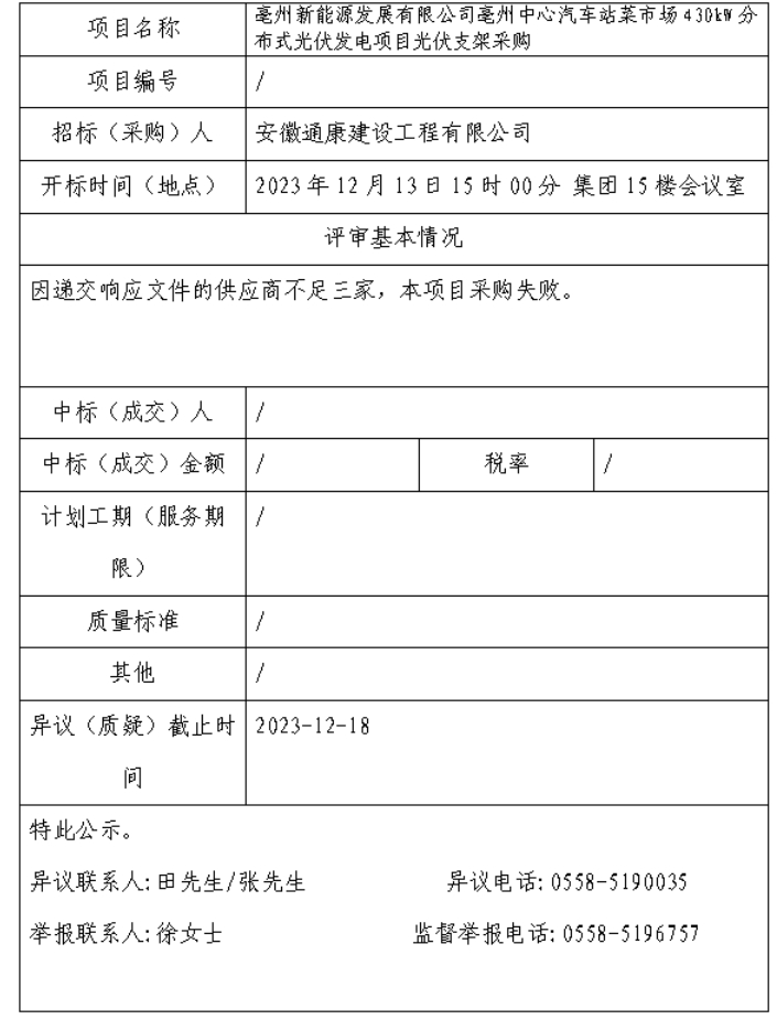 亳州新能源發(fā)展有限公司亳州中心汽車(chē)站菜市場(chǎng)430kW分布式光伏發(fā)電項(xiàng)目光伏支架采購(gòu)中標(biāo)(成交)結(jié)果公示