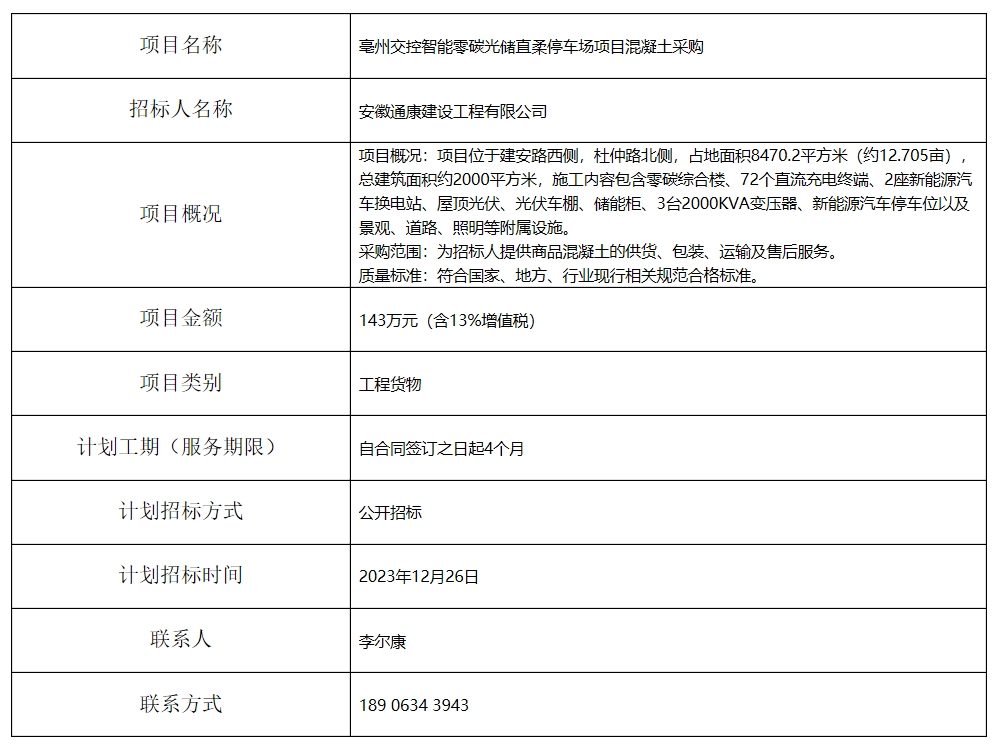 亳州交控智能零碳光儲直柔停車場項(xiàng)目混凝土采購招標(biāo)計(jì)劃