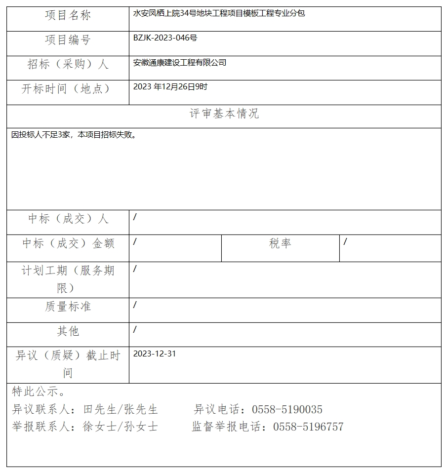 水安鳳棲上院34號地塊工程項(xiàng)目模板工程專業(yè)分包中標(biāo)(成交)結(jié)果公示