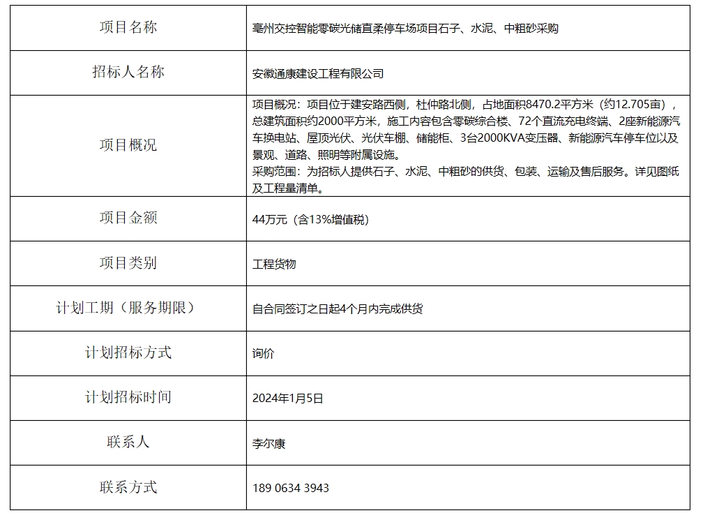亳州交控智能零碳光儲直柔停車場項目石子、水泥、中粗砂采購招標計劃