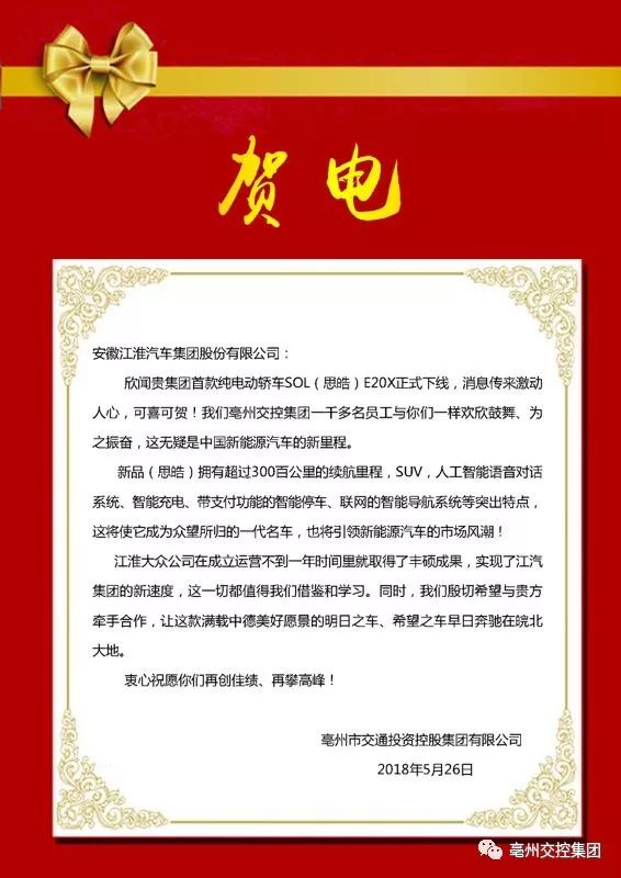 集團(tuán)公司獲此消息于次日發(fā)去賀電,向江淮汽車集團(tuán)表示祝賀!賀電全文如下: