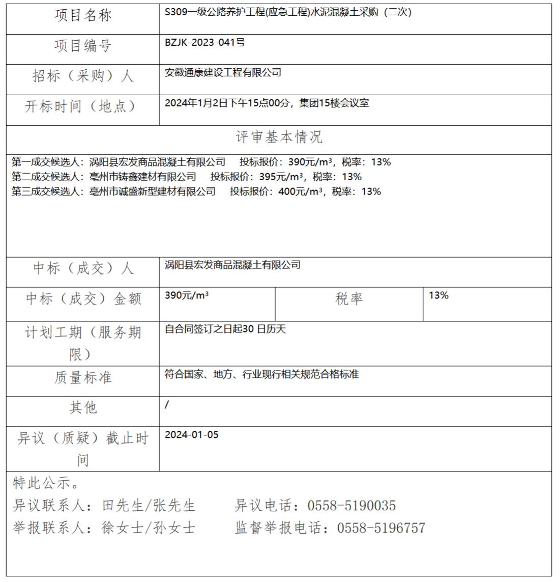 S309一級公路養(yǎng)護工程(應(yīng)急工程)水泥混凝土采購(二次)中標(biāo)(成交)結(jié)果公示