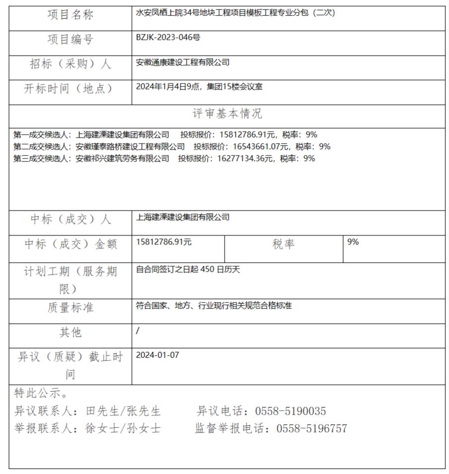 水安鳳棲上院34號地塊工程項目模板工程專業(yè)分包(二次)中標(biāo)(成交)結(jié)果公示