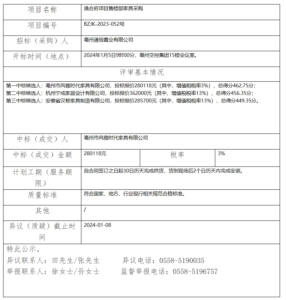 逸合府項目售樓部家具采購中標(成交)結(jié)果公示