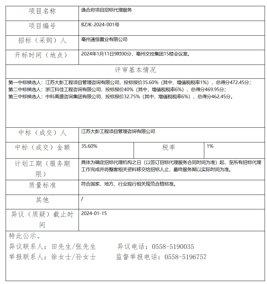 逸合府項(xiàng)目招標(biāo)代理服務(wù)中標(biāo)(成交)結(jié)果公示