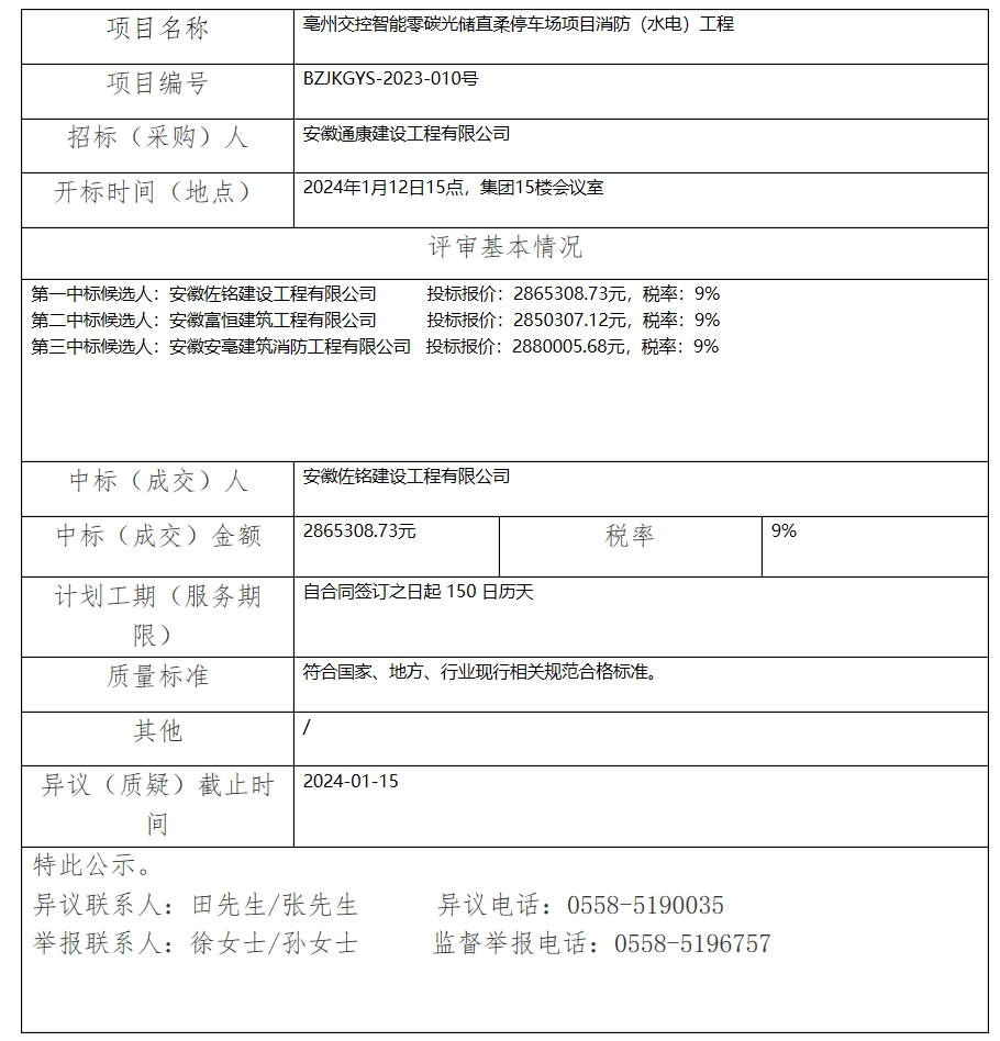 亳州交控智能零碳光儲(chǔ)直柔停車場(chǎng)項(xiàng)目消防(水電)工程 中標(biāo)(成交)結(jié)果公示