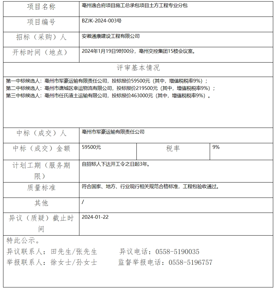 亳州逸合府項目施工總承包項目土方工程專業(yè)分包中標(biāo)(成交)結(jié)果公示